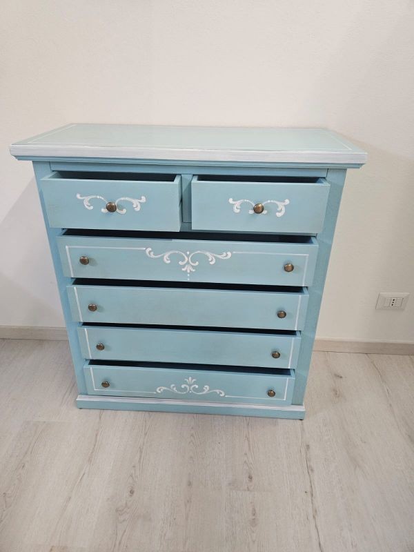 - Tipologia: cassettiera 6 cassetti decorata (4 cassetti e 2 cassettini).