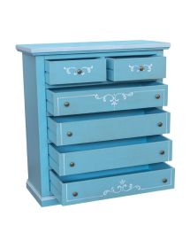 Con i suoi sei pratici cassetti, di cui due più piccoli e quattro più ampi, questa cassettiera azzurra shabby è la scelta perfetta per tenere tutto in ordine con eleganza.