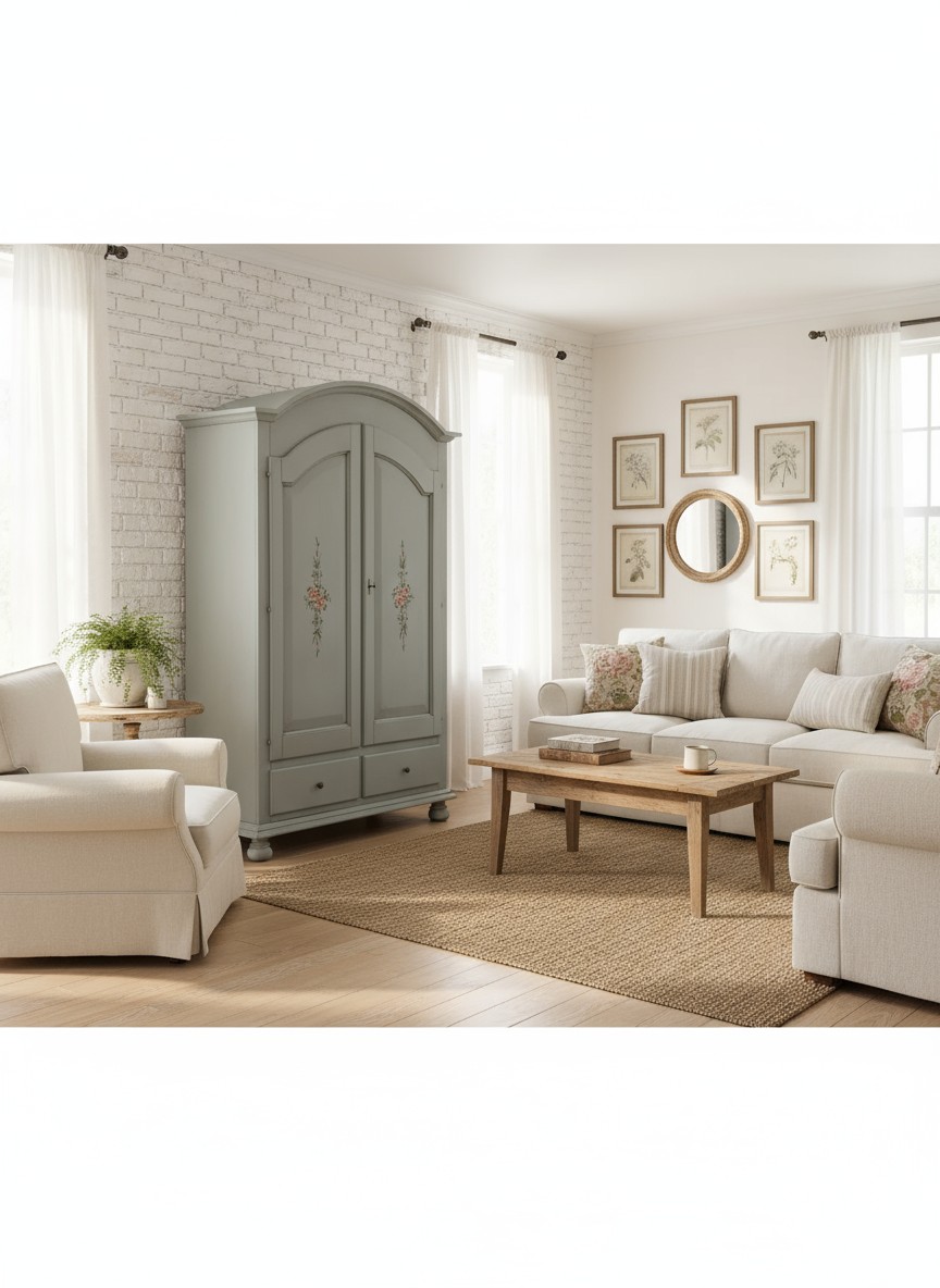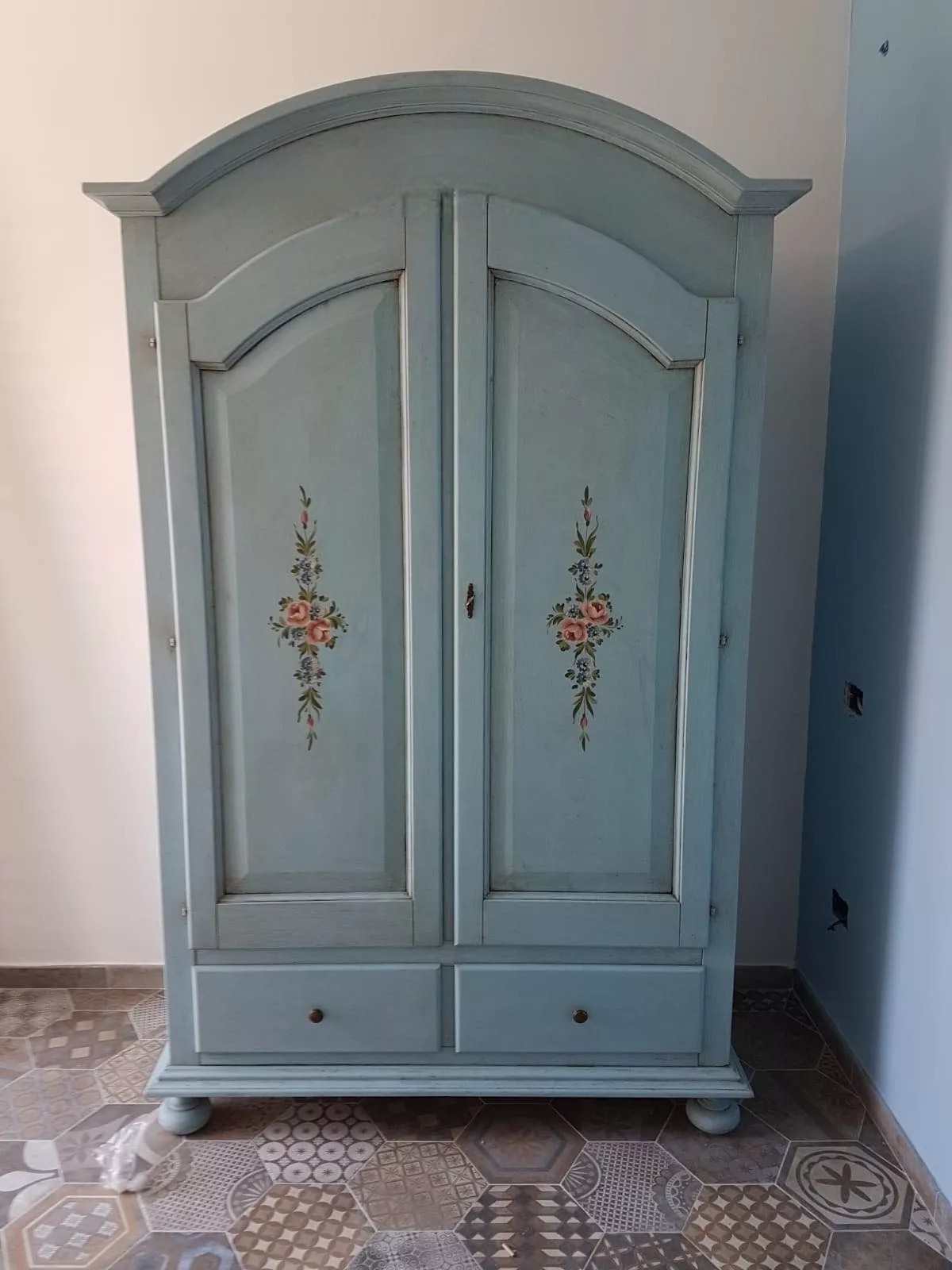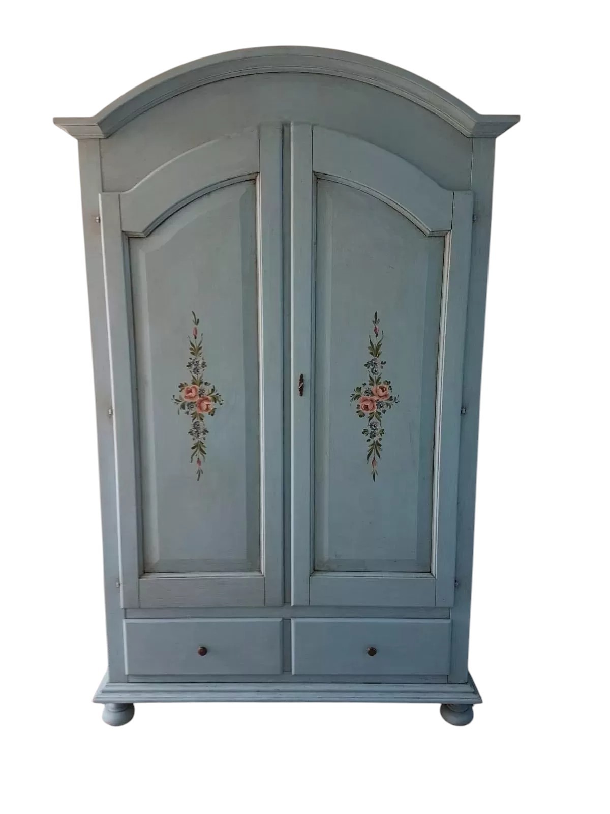 ARMADIO 2 PORTE 2 CASSETTI CAPPELLO GENDARME CERATO AZZURRO CON DECORI FLOREALI