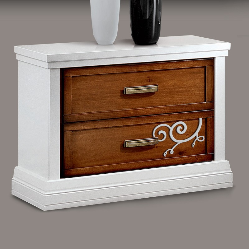 - 2 comodini classici con 2 cassetti con decori in rilievo: Larghezza 63 cm x Profondità 39 cm x Altezza 54 cm